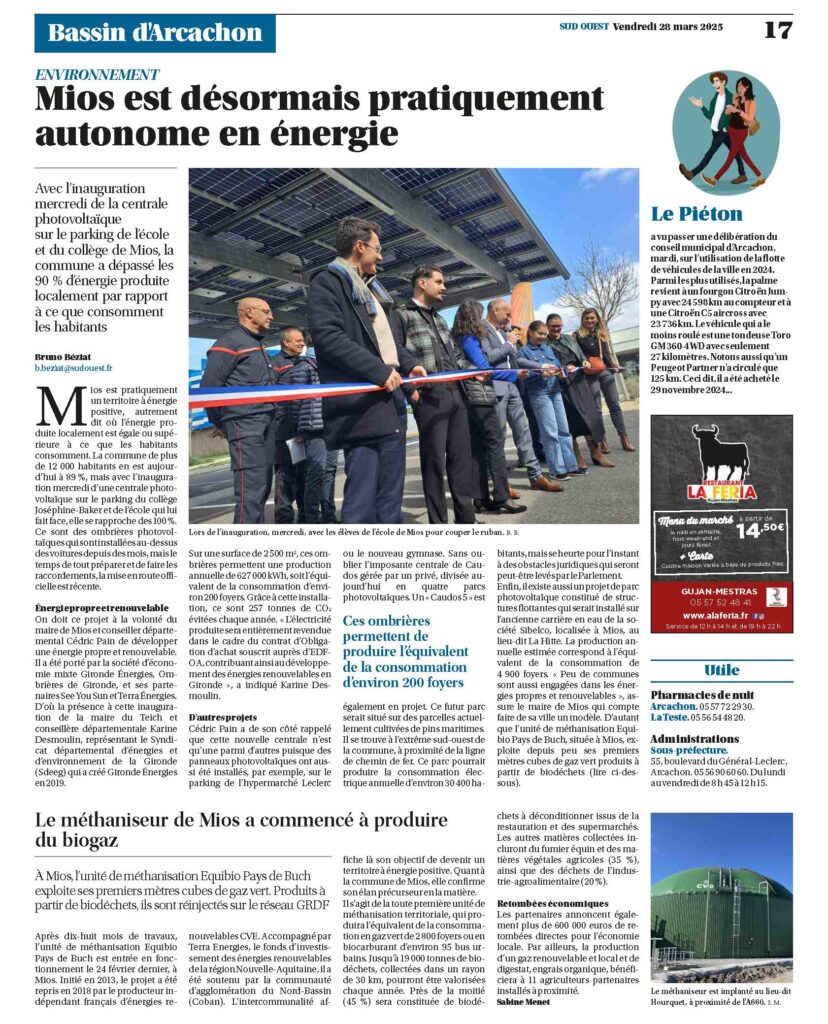 On parles de nous…Inauguration à Mios 4 avril 2025 4 avril 2025 On parle de nous... Mios : ce parking produit de l’énergie solaire photovoltaïque Article TVBA.fr Mios est désormais pratiquement autonome en énergie