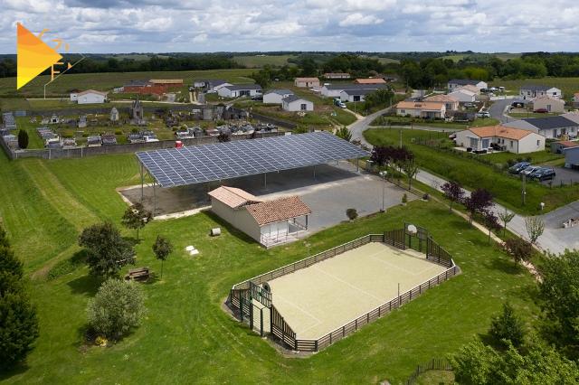 Structure ombrière sur le parking du complexe sportif de la commune de Capian permettant de recevoir des modules photovoltaïques de technologie cristalline.